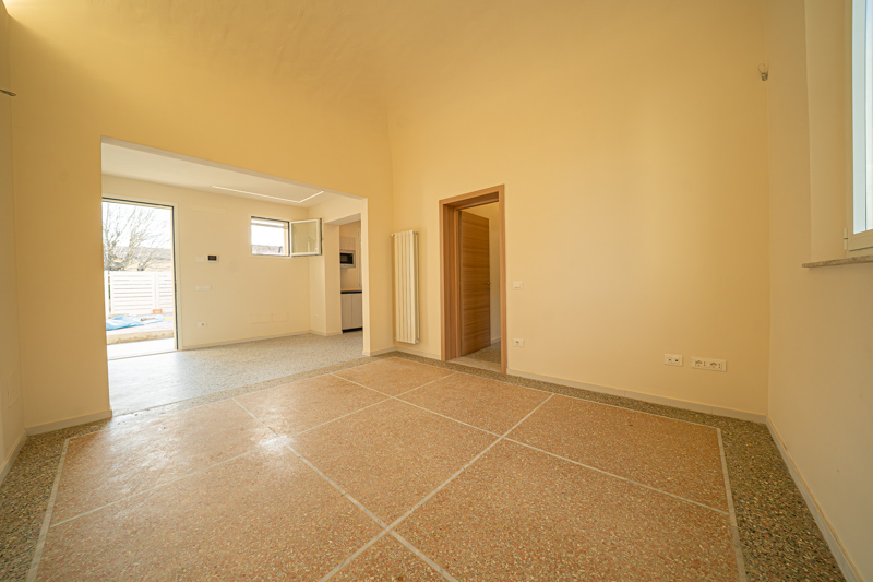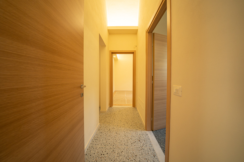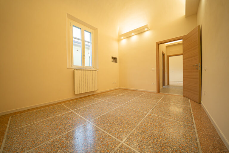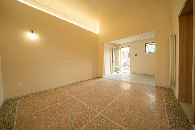 Il tocco di classe? I dettagli. Soffitti alti a volte e pavimenti alla veneziana originali sono stati recuperati e valorizzati, dialogando perfettamente con infissi termici di ultima generazione e finiture contemporanee.
