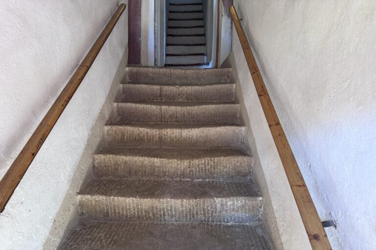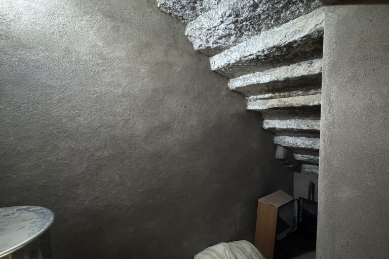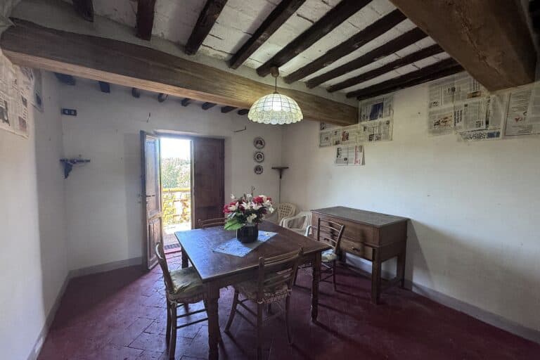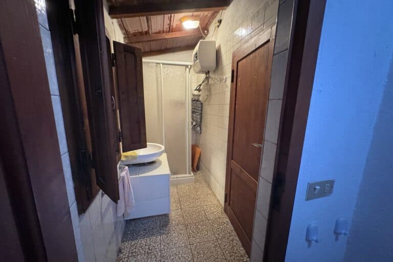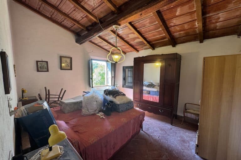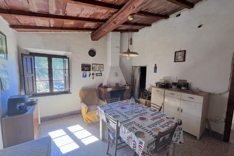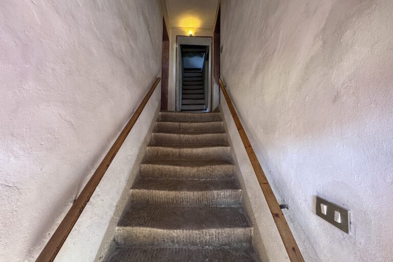 Centralmente la vecchia scala in pietra ci porta al piano primo dove troviamo la vecchia cucina con il camino, una camera ed una cameretta con una graziosissima terrazza con vista. Proseguendo per la scala si raggiunge il sottotetto dove si trovano due ampi locali.