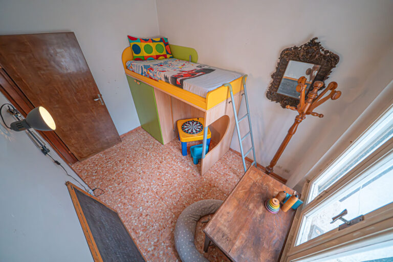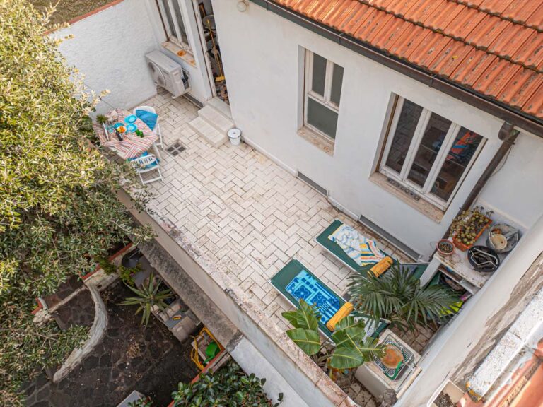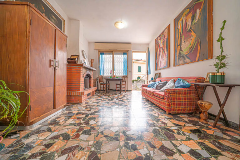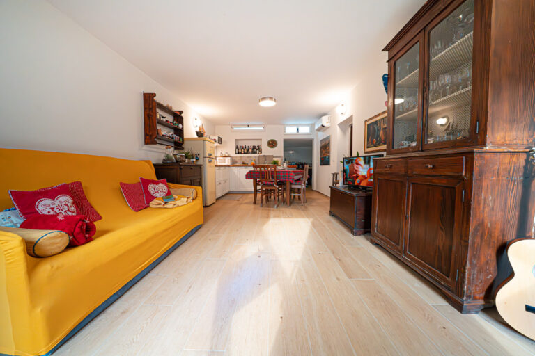 L’appartamento al piano superiore è impreziosito da un suggestivo camino funzionante e dispone di una zona esterna sul retro, ideale per cene all’aperto o momenti di relax.