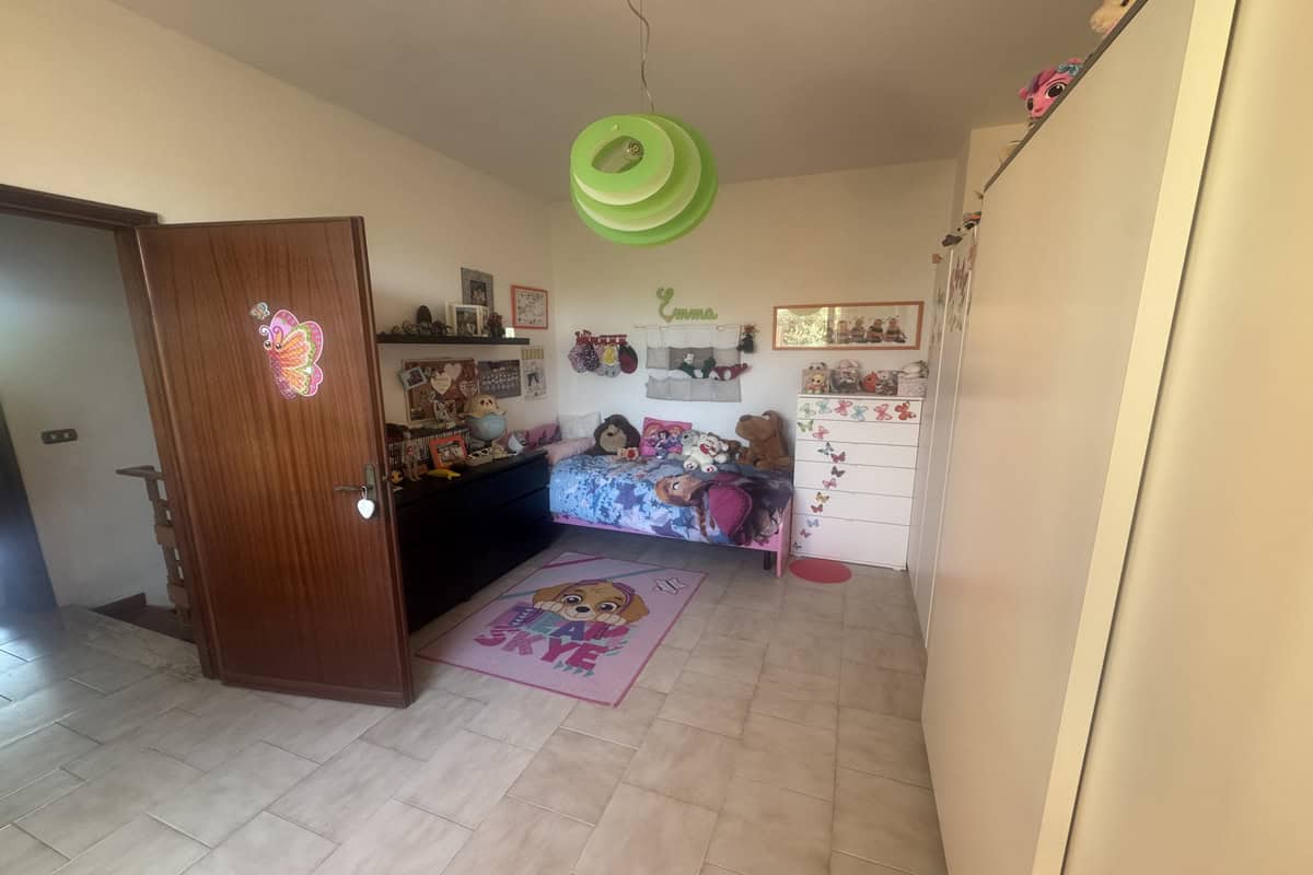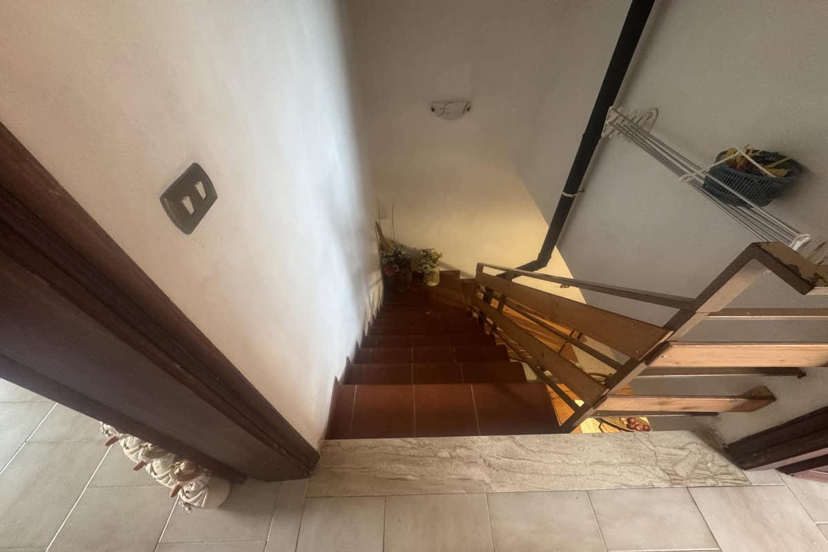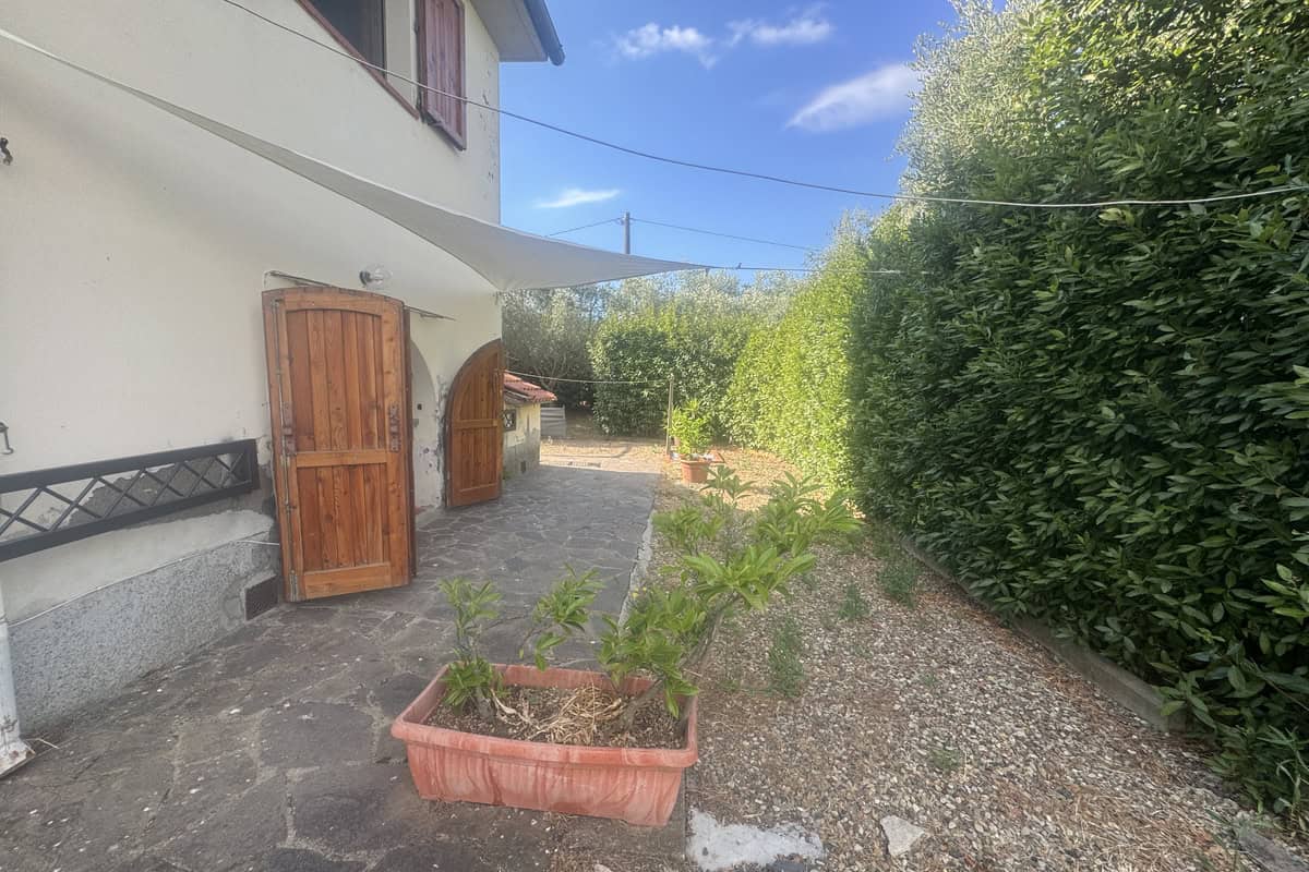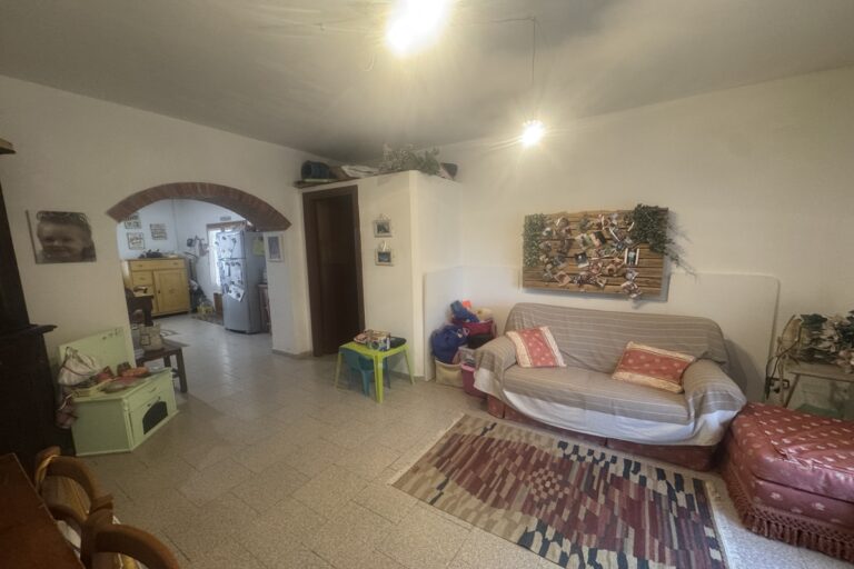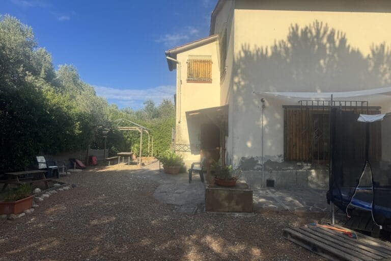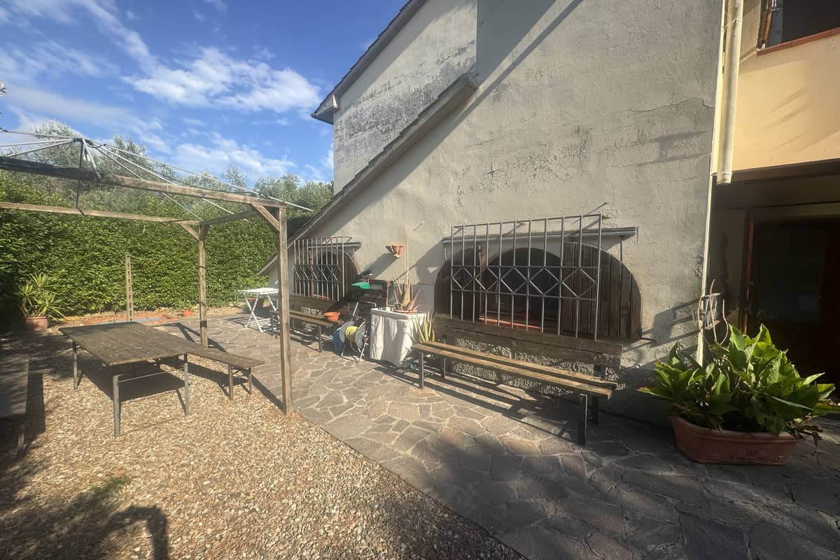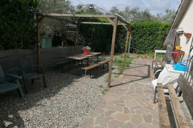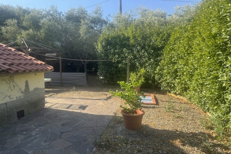 Completa la proprietà un ampio giardino di 700mq con pergola e una ventina di piante d’ulivo. L’ingresso dal cancello è comune.